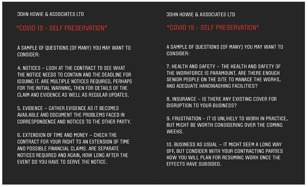 COVID 19 - Self Preservation John Howie & AssociatesApr 27, 20201 min readHave you taken sufficient action to protect your business & construction sites affected by Covid 19?Want to learn more, have a look at the attached presentation.